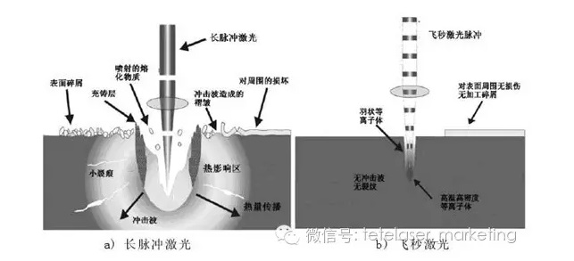 因此,對(duì)于10皮秒左右的皮秒激光加工,材料有足夠的時(shí)間把熱量傳遞到其內(nèi)部,然后才發(fā)生刻蝕作用,因此熱效應(yīng)實(shí)際上無(wú)法避免。而對(duì)于飛秒激光而言,脈沖作用時(shí)間已經(jīng)實(shí)際小于1皮秒,電子沒(méi)有足夠的時(shí)間將能量傳遞給晶格。從而在材料表面生成眾多等離子體,能量伴隨著材料的去除而消散,因此出現(xiàn)強(qiáng)烈的刻蝕效果。也就是說(shuō),當(dāng)激光脈寬遠(yuǎn)遠(yuǎn)小于晶格的受熱時(shí)間時(shí),燒蝕時(shí)間不依賴于激光脈寬。