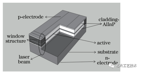 影響激光器功率提高的主要因素是腔面災變性光學損傷(COMD).COMD 主要發(fā)生在激光器的出光腔面上,在輸出功率較大時,腔面的光功率密度增大,當 AlGaInP激光器的腔面功率密度達到1~5MW/cm2時,激光器腔面處的缺陷數(shù)量就會不斷增加,并向內(nèi)部遷移,導致激光器發(fā)生 COMD,輸出功率急速下降.研究人員經(jīng)過大量的理論分析和實踐探索,發(fā)現(xiàn)在激光器腔面制作非吸收窗口結構可以有效抑制 COMD現(xiàn)象。通過快速退火的方式將 Zn作為雜質(zhì)擴散到有源區(qū),Zn擴散加強了 AlGaInP 自然超晶格的無序性,也增加了擴散區(qū)量子阱的能帶寬度.而有源區(qū)以外帶隙寬度較小的區(qū)域無法吸收振蕩的激光,稱為窗口區(qū).非吸收窗口的出現(xiàn)大大降低了整個發(fā)光區(qū)的溫度,有效抑制了 COMD現(xiàn)象.下圖為帶有窗口結構的半導體激光器.