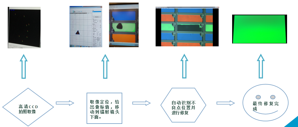 主要應(yīng)用于TFT-LCD、IPS、LTPS、OLED等顯示面板行業(yè),針對(duì)制程當(dāng)中發(fā)光區(qū)域內(nèi)產(chǎn)生的亮點(diǎn)、灰亮點(diǎn)、亮線不良進(jìn)行鐳射修復(fù)。整個(gè)修復(fù)過程是通過高清像素CCD自動(dòng)定位,拍照取像分析,給出不良點(diǎn)坐標(biāo),然后計(jì)算機(jī)根據(jù)指令將修復(fù)用的鐳射鏡頭移動(dòng)到位,自動(dòng)識(shí)別出不良點(diǎn)的形狀大小,激光會(huì)做出不同方式的維修。詳見如下圖解: