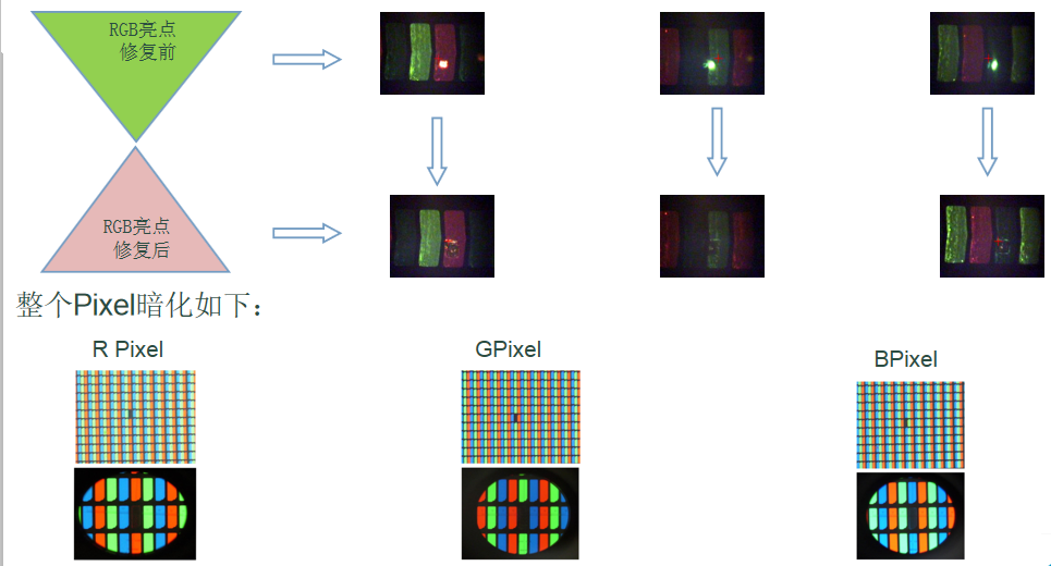 超快激光亮點(diǎn)修復(fù)特點(diǎn):可以直接針對(duì)一個(gè)pixel里的異物亮點(diǎn)進(jìn)行單獨(dú)暗 化修復(fù),而不影響周圍區(qū)域發(fā)光。